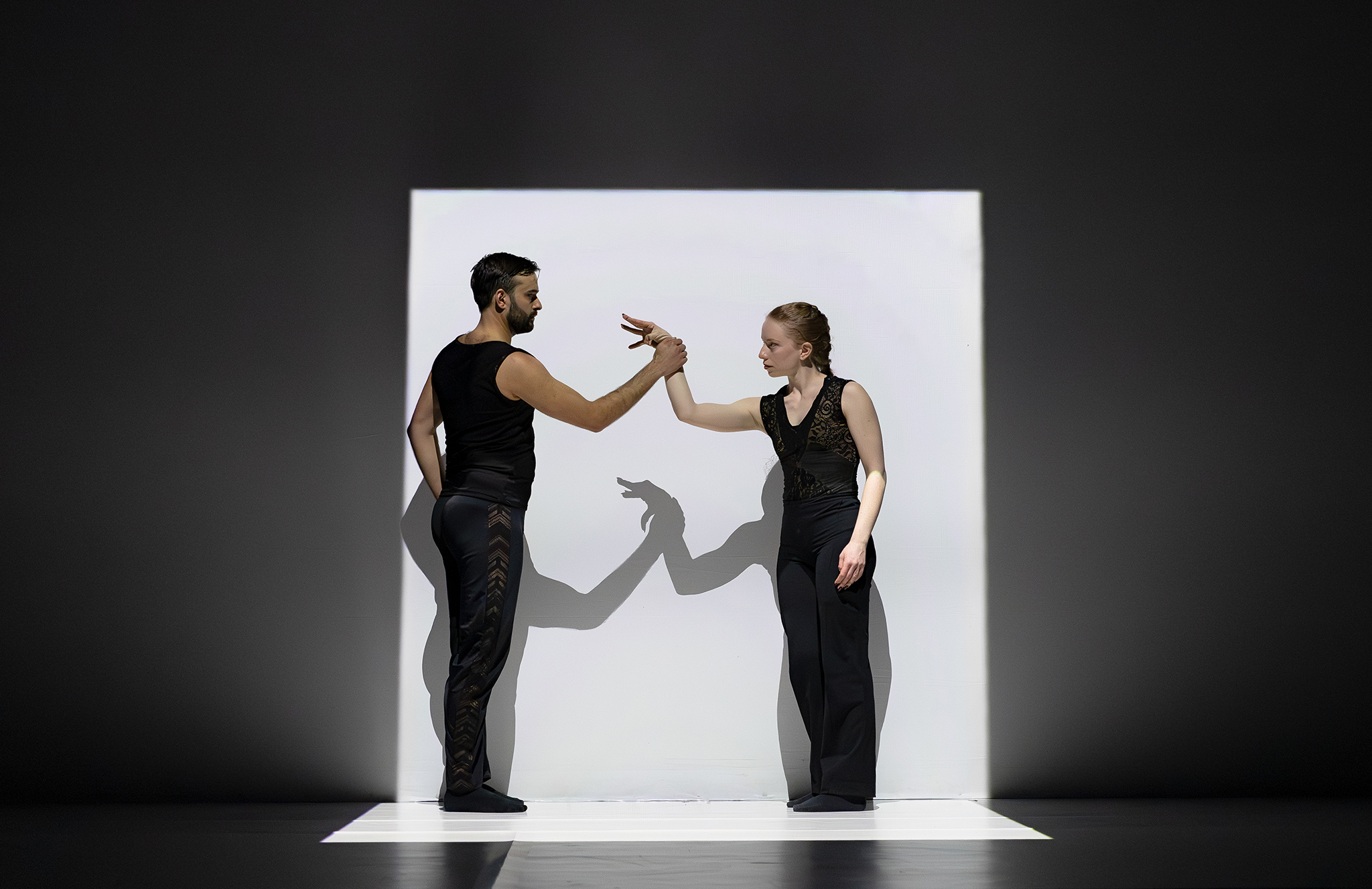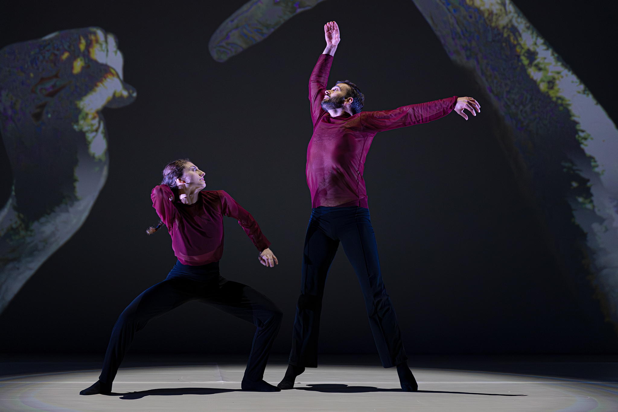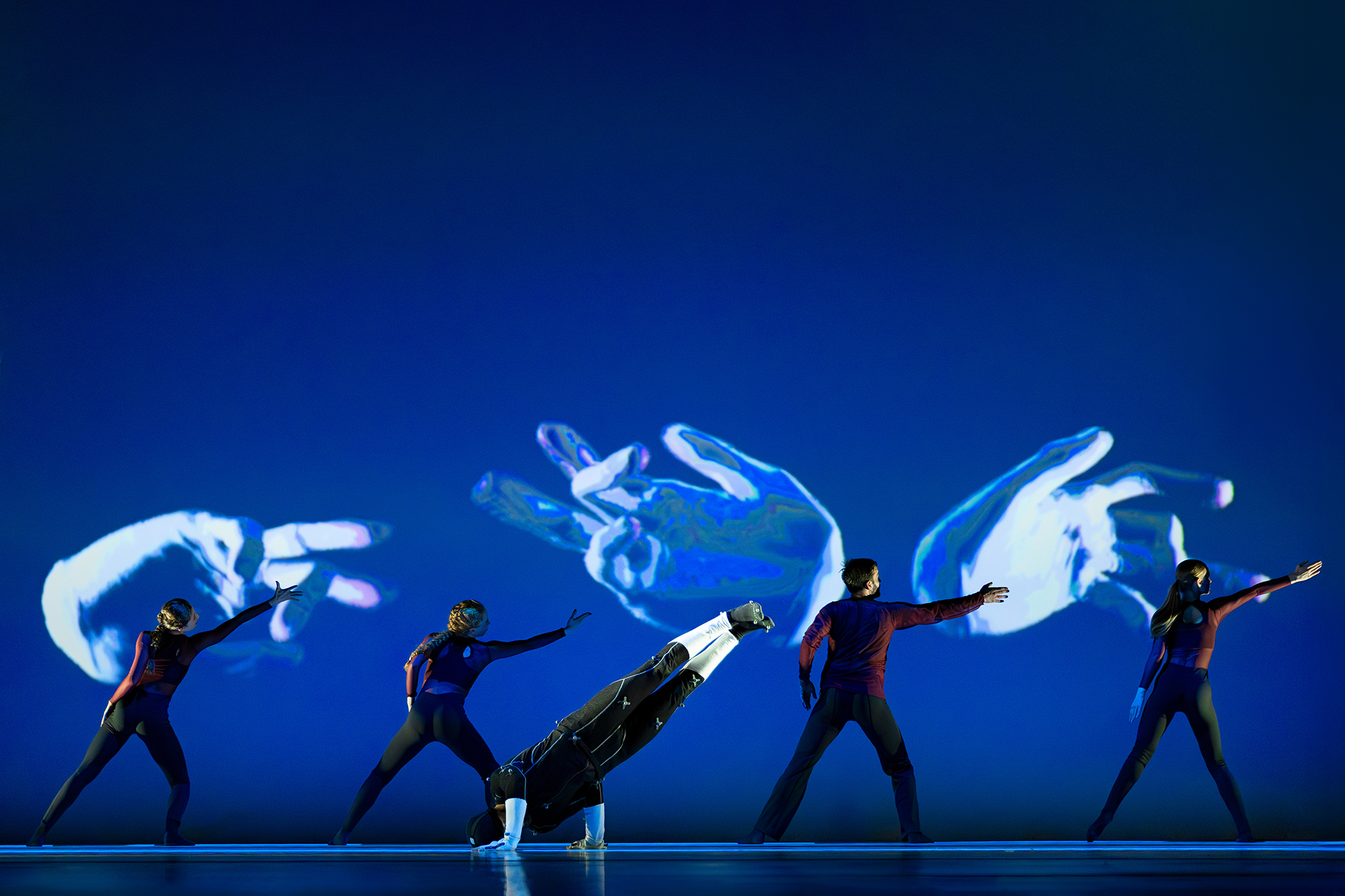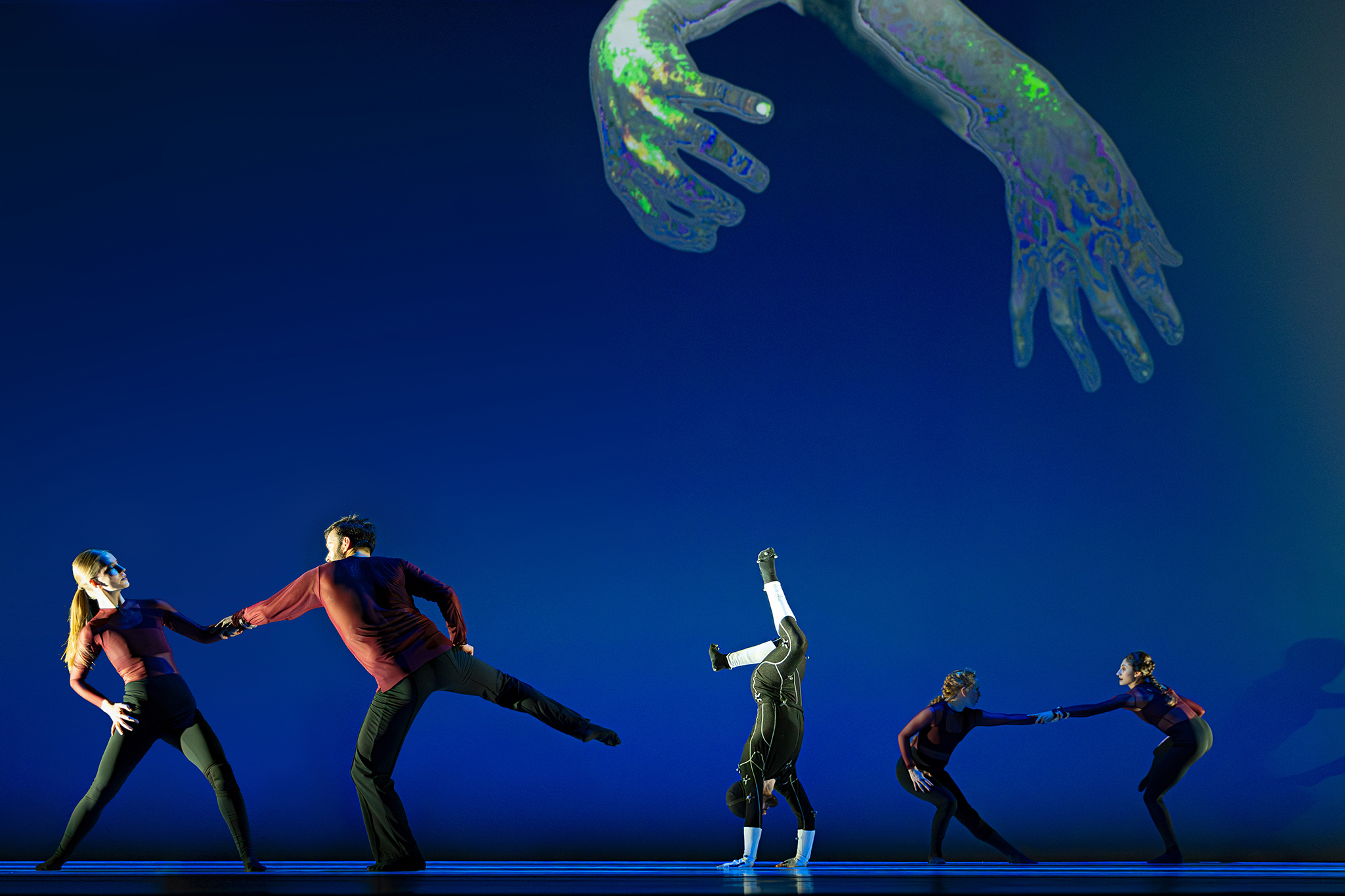 Zoals altijd bij Another Kind of Blue speelt technologie een belangrijke rol, maar hier is ze subtieler aanwezig — als verlengstuk van het lichaam.Virtuele handen bewegen mee via motion capture, terwijl in het werk Arms drones samen een bovenlijf vormen dat reageert op improviserende dansers. Zo ontstaat een directe dialoog tussen mens en machine, waarin technologie niet alleen ondersteunt, maar zelf lijkt mee te voelen. En in Flyland (2016) lijken dansers door de lucht te vallen, gevangen en voortgestuwd door hun eigen schaduwen. Licht en projectie worden hier een danspartner die de wetten van de zwaartekracht opheft en de grenzen van het lichaam vervaagt.