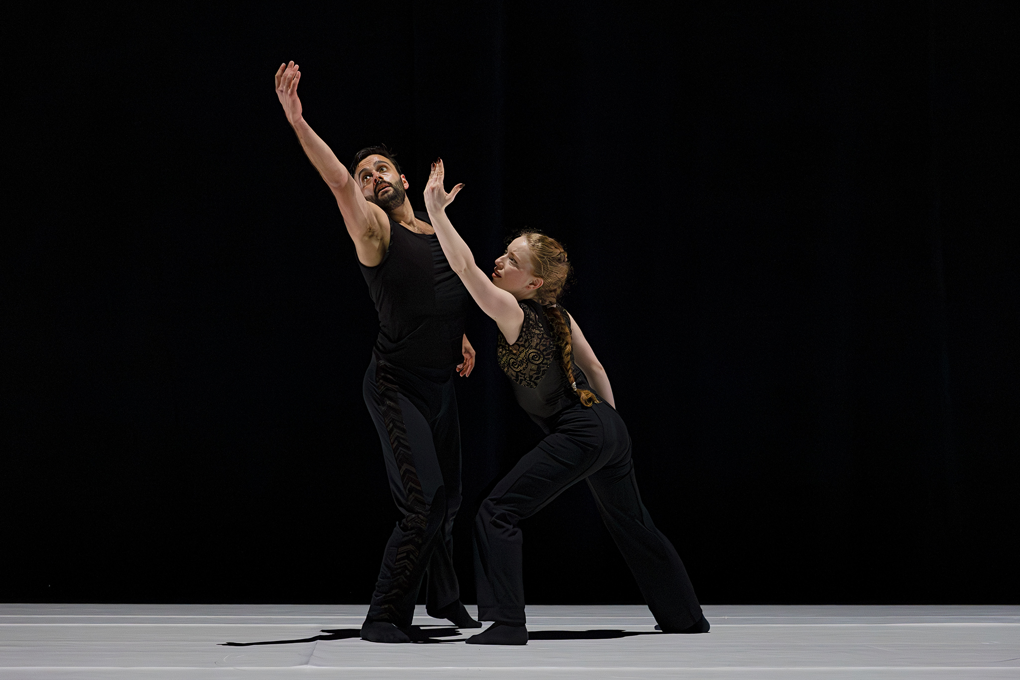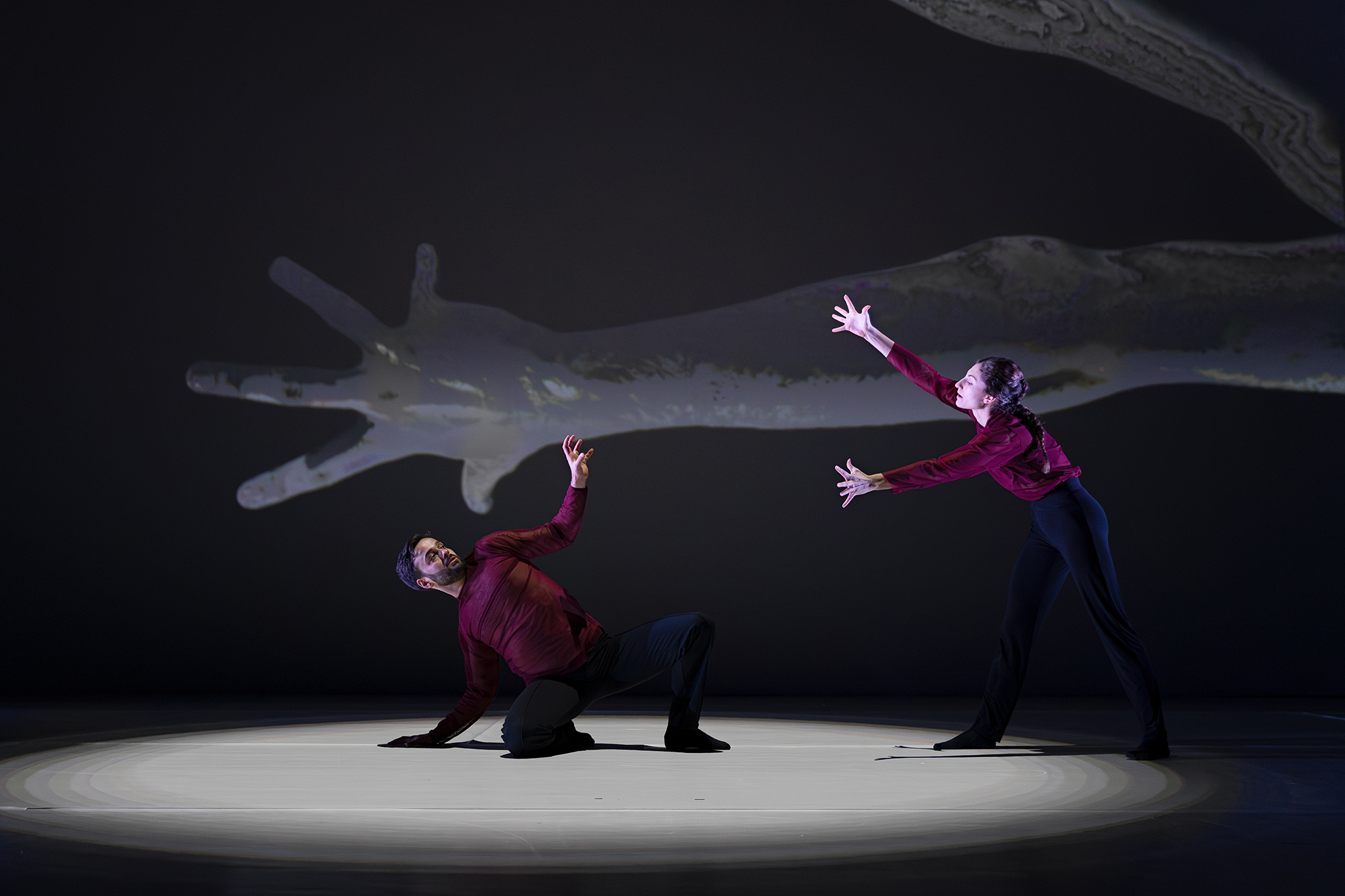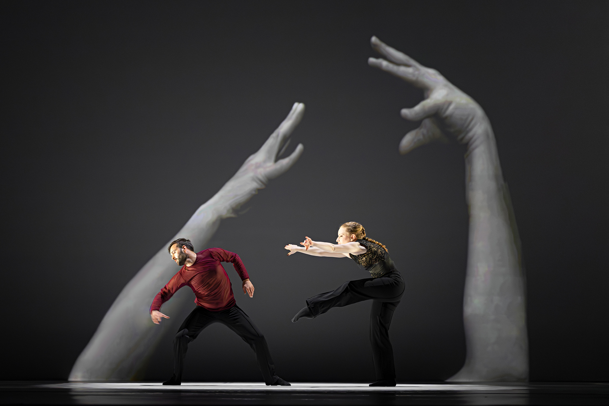 Zoals altijd bij Another Kind of Blue speelt technologie een belangrijke rol, maar hier is ze subtieler aanwezig — als verlengstuk van het lichaam.Virtuele handen bewegen mee via motion capture, terwijl in het werk Arms drones samen een bovenlijf vormen dat reageert op improviserende dansers. Zo ontstaat een directe dialoog tussen mens en machine, waarin technologie niet alleen ondersteunt, maar zelf lijkt mee te voelen. En in Flyland (2016) lijken dansers door de lucht te vallen, gevangen en voortgestuwd door hun eigen schaduwen. Licht en projectie worden hier een danspartner die de wetten van de zwaartekracht opheft en de grenzen van het lichaam vervaagt.