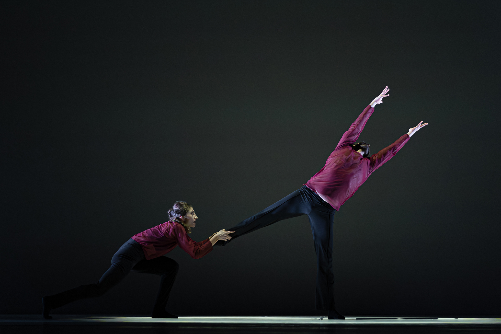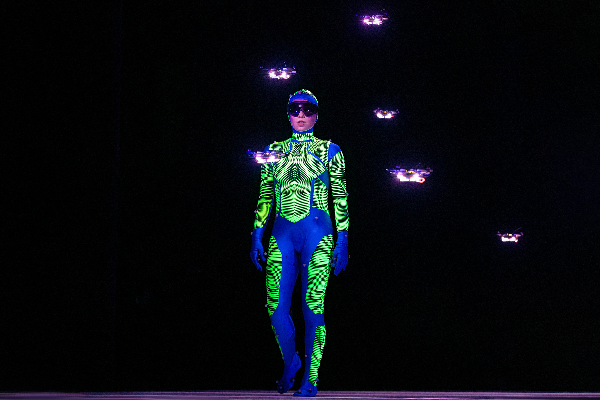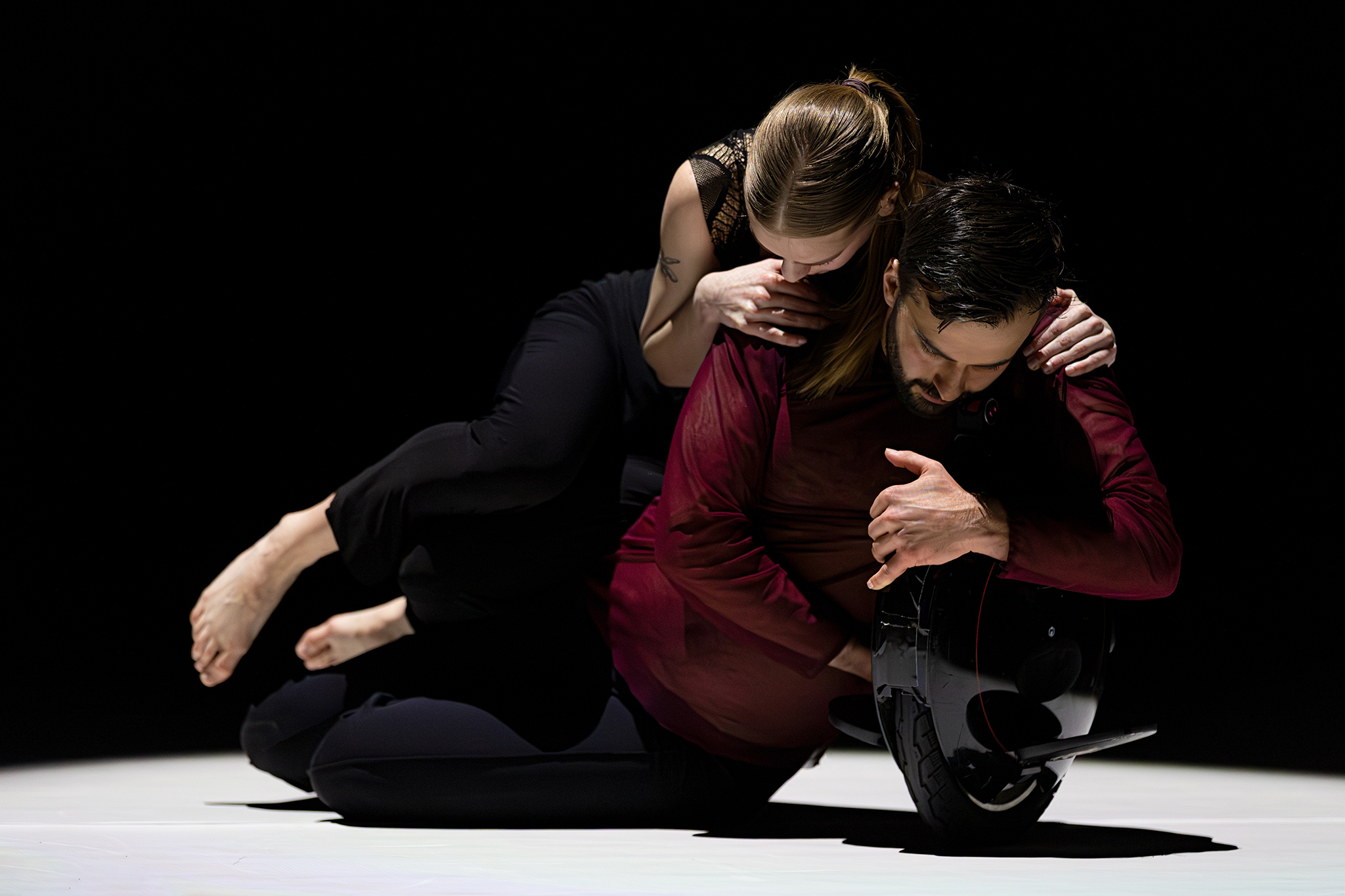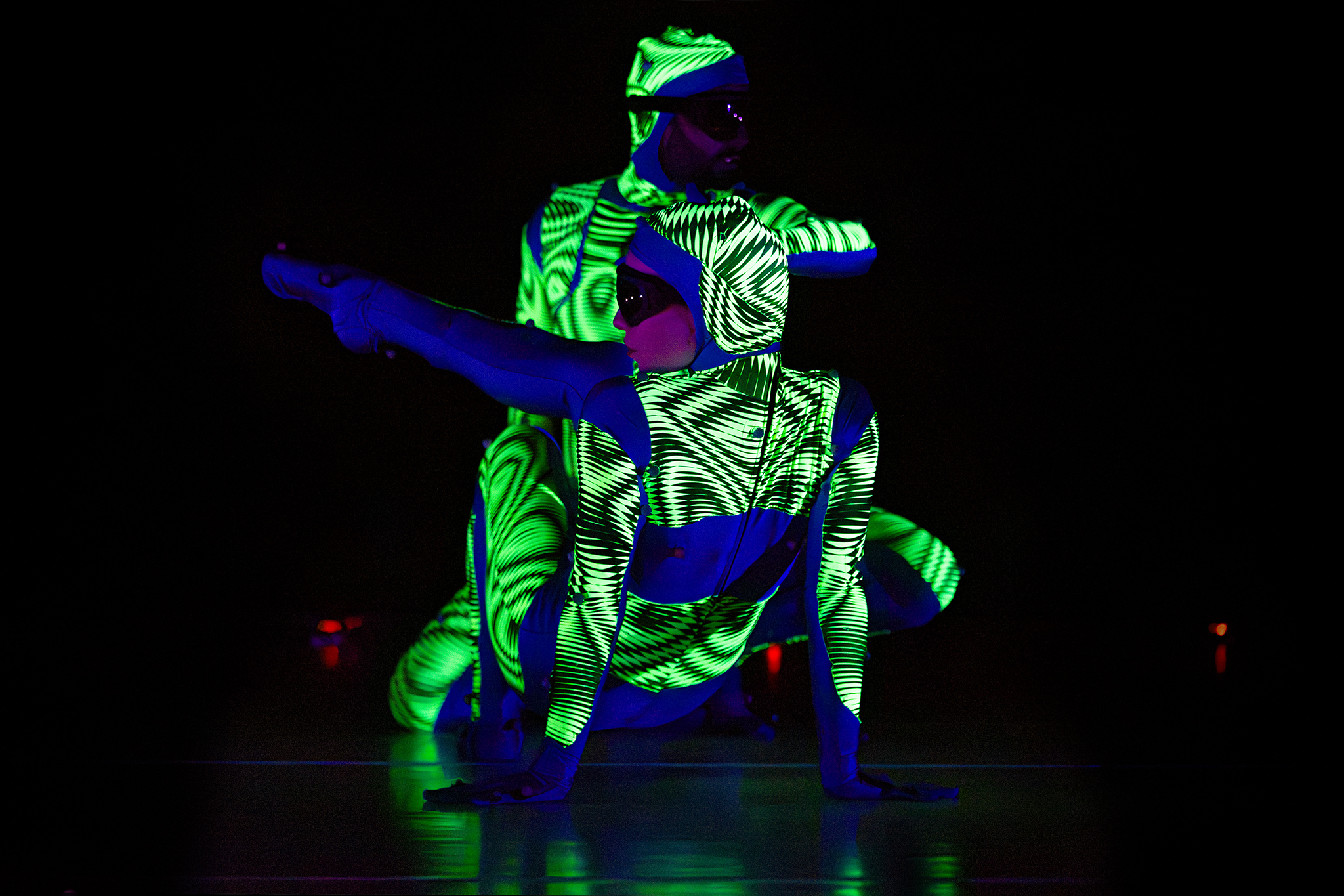 Zoals altijd bij Another Kind of Blue speelt technologie een belangrijke rol, maar hier is ze subtieler aanwezig — als verlengstuk van het lichaam.Virtuele handen bewegen mee via motion capture, terwijl in het werk Arms drones samen een bovenlijf vormen dat reageert op improviserende dansers. Zo ontstaat een directe dialoog tussen mens en machine, waarin technologie niet alleen ondersteunt, maar zelf lijkt mee te voelen. En in Flyland (2016) lijken dansers door de lucht te vallen, gevangen en voortgestuwd door hun eigen schaduwen. Licht en projectie worden hier een danspartner die de wetten van de zwaartekracht opheft en de grenzen van het lichaam vervaagt.